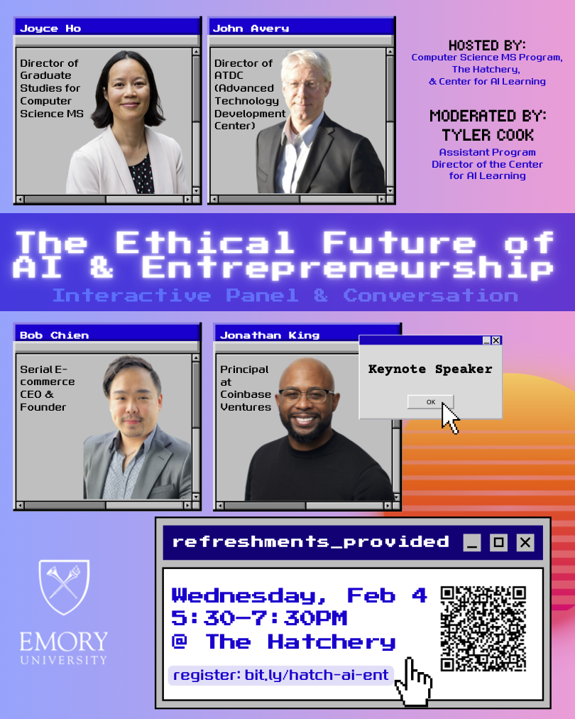 Time: 5:30-7:30 p.m. Date: Wednesday, February 4 Location: The Hatchery, 1578 Avenue Pl #200, Atlanta, GA 30329 👉Register here Questions? Contact Mathew Estrada, computer science, program coordinator, at mdestra@emory.edu.
