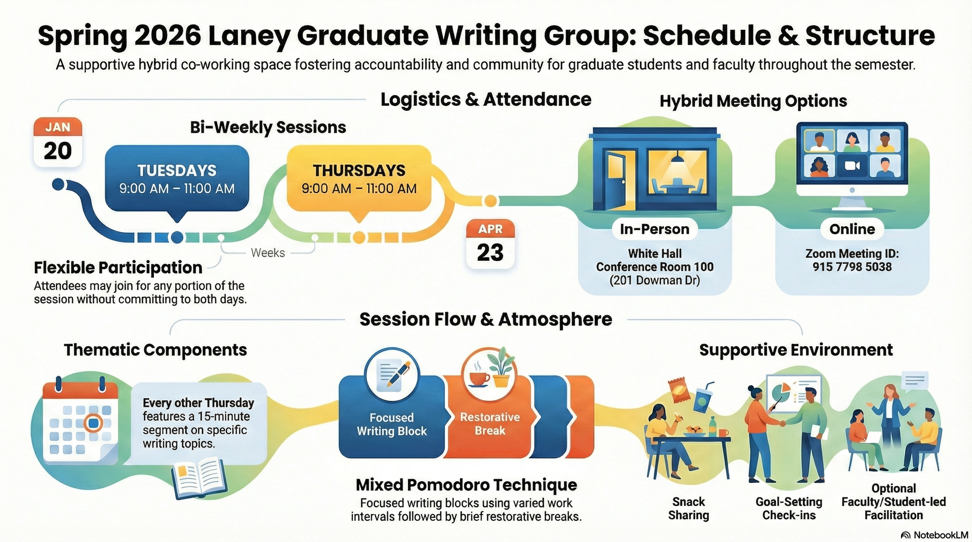Meeting times: Tuesdays and Thursdays from 9-11 a.m. Dates: Jan. 20 – Apr. 23, 2026 Location: White Hall, Conference Room 100 (in-person) Zoom Meeting ID 91577985038 (online)