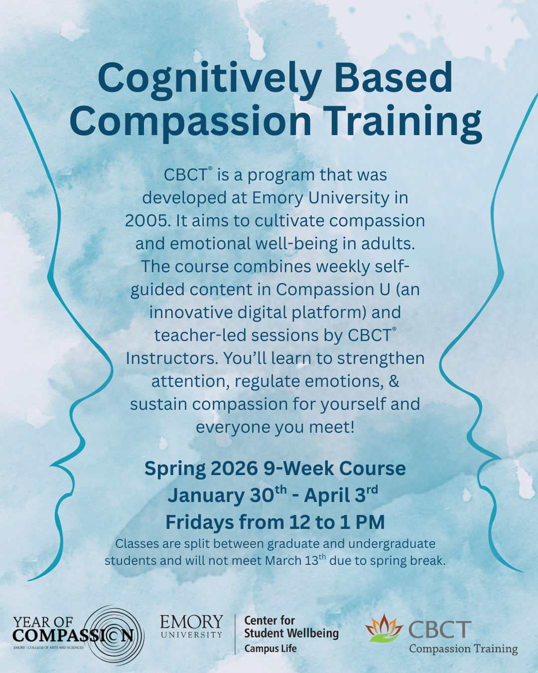 CBCT is an evidence-based program developed at Emory’s Center for Compassion-Based Ethics that strengthens emotional regulation, resilience, and wellbeing. The program has demonstrated that compassion, especially self-compassion, reduces stress, improves mood stability, and helps individuals respond to challenges with greater clarity and care. These skills are particularly valuable for students navigating academic pressure, interpersonal stress, and ongoing uncertainty.